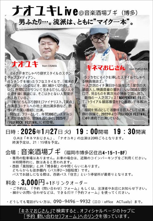 ・O.Aは「キネマおじさん」、20時ごろより「ナオユキ」の出演となります。