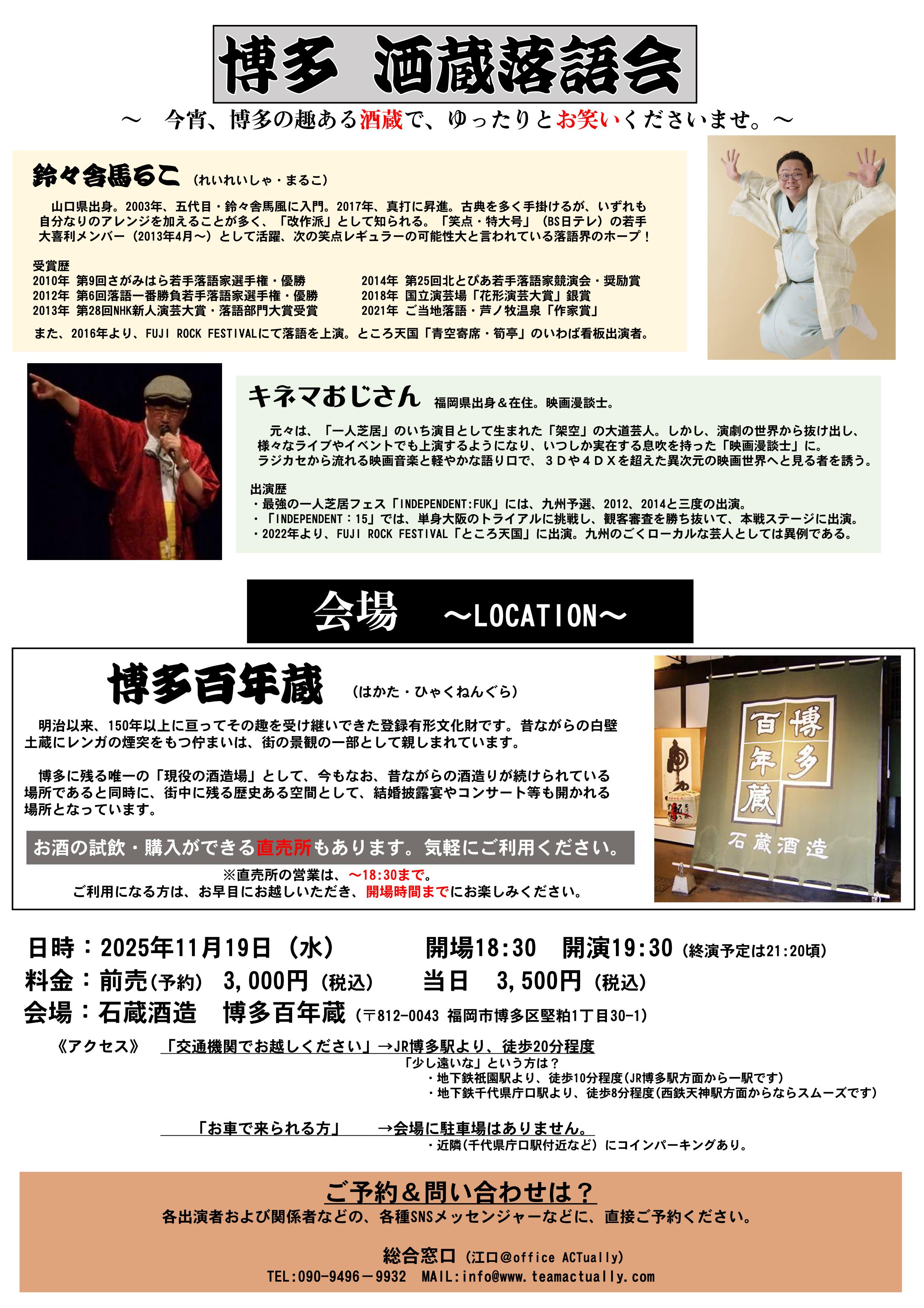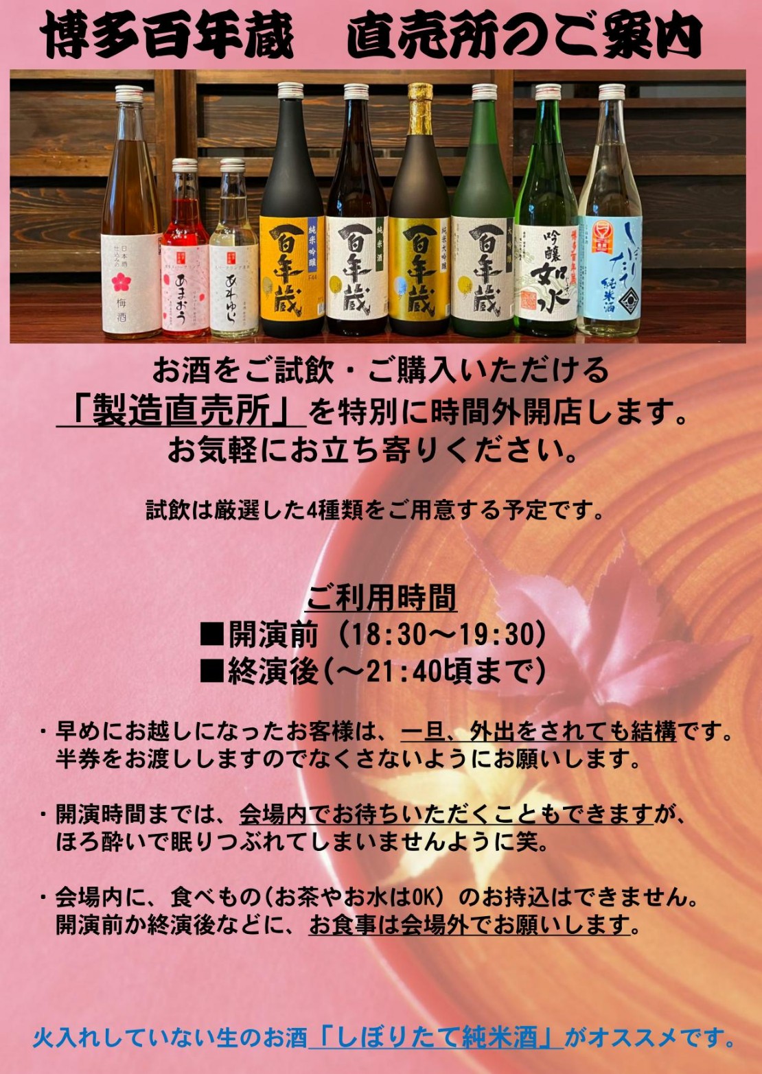 今宵、博多の趣ある酒蔵で、ゆったりとお笑いくださいませ。